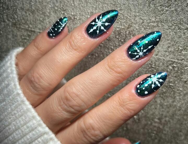 Deep, shimmering teal nails with bright white snowflake bursts create a striking nighttime-winter feel. The contrast makes the design bold, sleek, and perfect for a dramatic winter look.