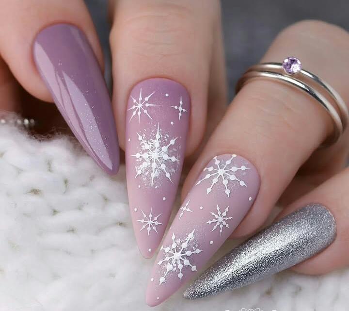 These long, almond-shaped nails blend matte lilac and soft mauve tones with crisp white snowflakes scattered across the surface. The silver accent nail adds a bold frosty touch, giving the whole set a magical winter vibe.