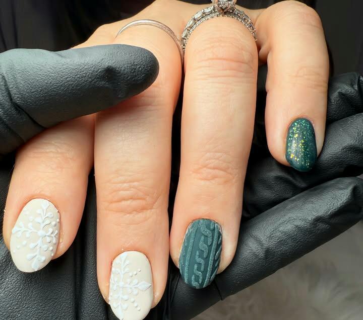 This set pairs creamy white nails embossed with subtle snowflakes and leafy accents with deep green textured sweater-pattern accents. The mix of matte and shimmer gives it a cozy, winter-sweater feel.