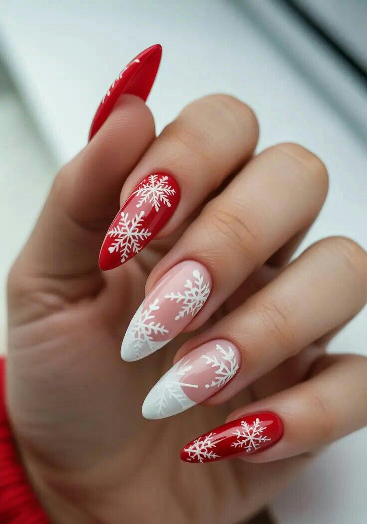 A festive mix of red, white, and soft pink creates a cheerful holiday look. The white snowflakes over glossy red and frosted tips bring a playful, Christmas-inspired vibe.