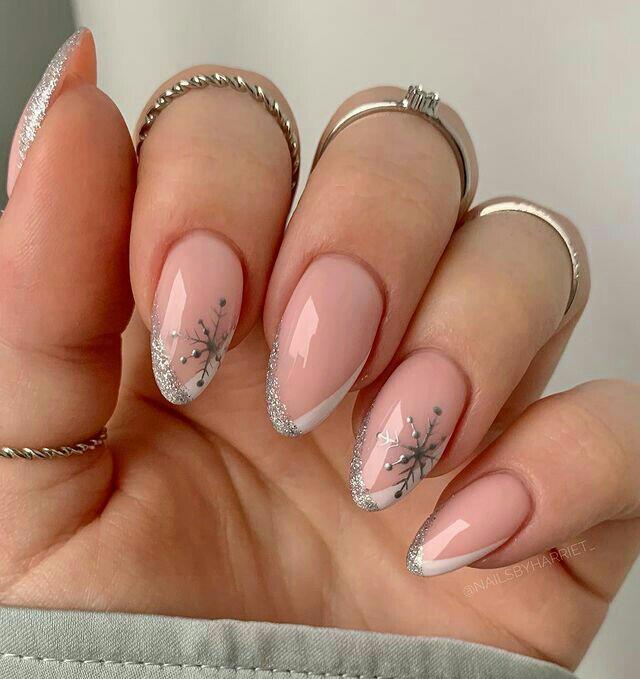 A soft nude base meets silver glitter French tips, paired with fine snowflake-style line art for a clean and elegant winter look. The design feels minimal, frosty, and perfect for anyone who wants something simple yet seasonal.