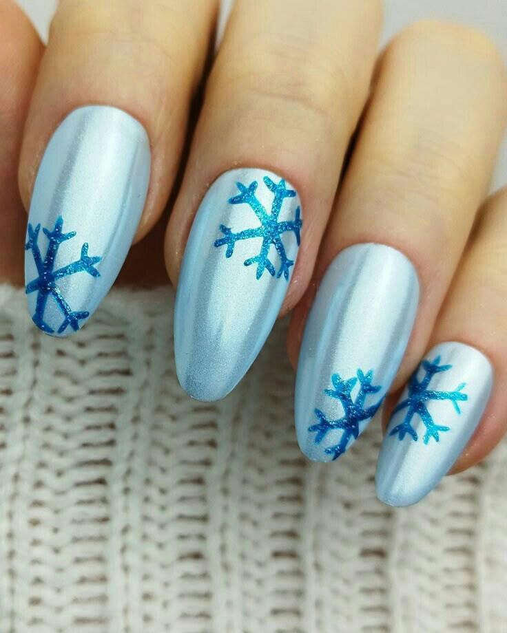 This design features sleek, pearly blue nails accented with bold, bright blue snowflakes. The look is clean, frosty, and winter-fresh, giving a crisp icy vibe.