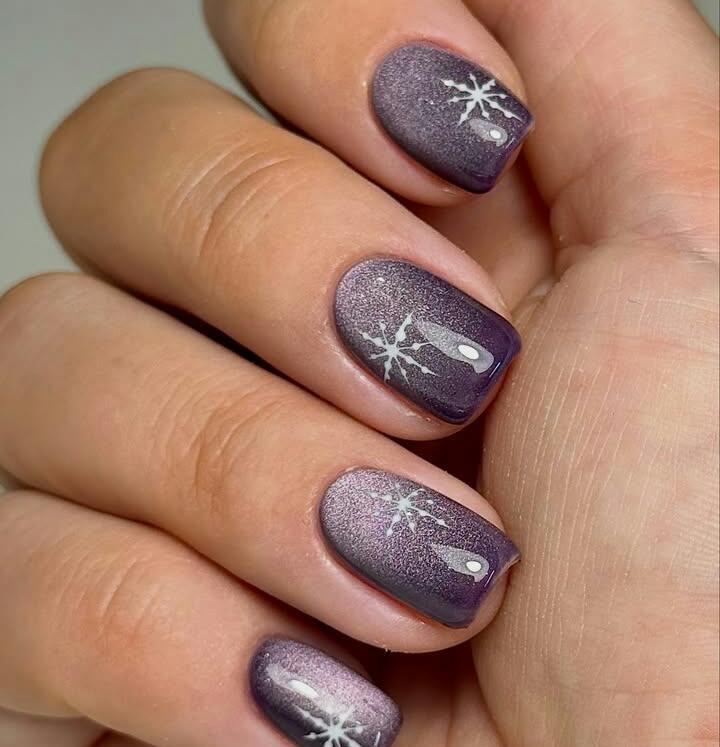 A deep plum-purple shimmer base gives this set a moody winter glow, topped with delicate white snowflake accents. The overall vibe is elegant, subtle, and wintry.