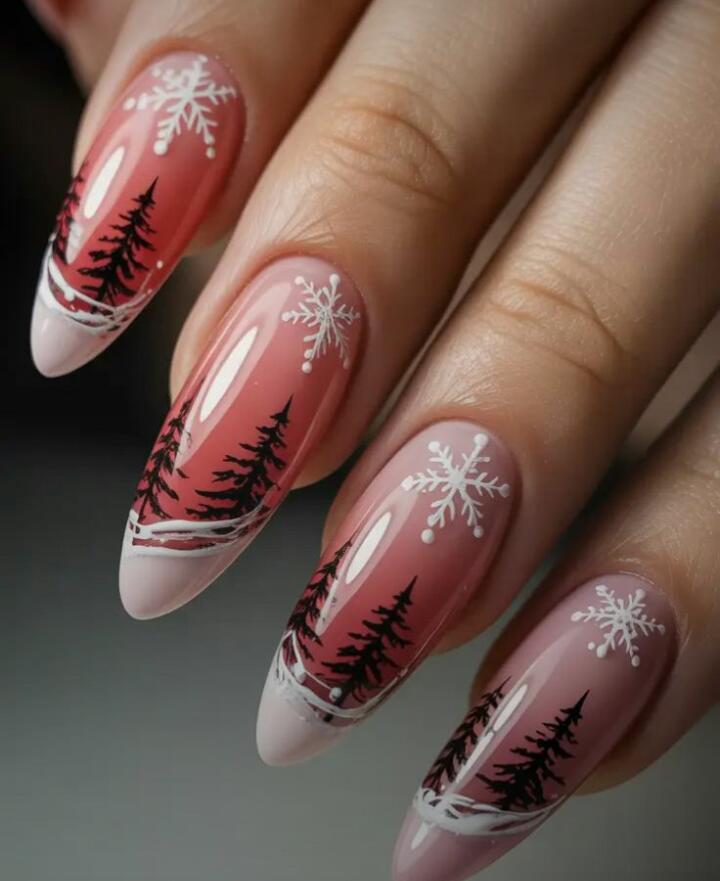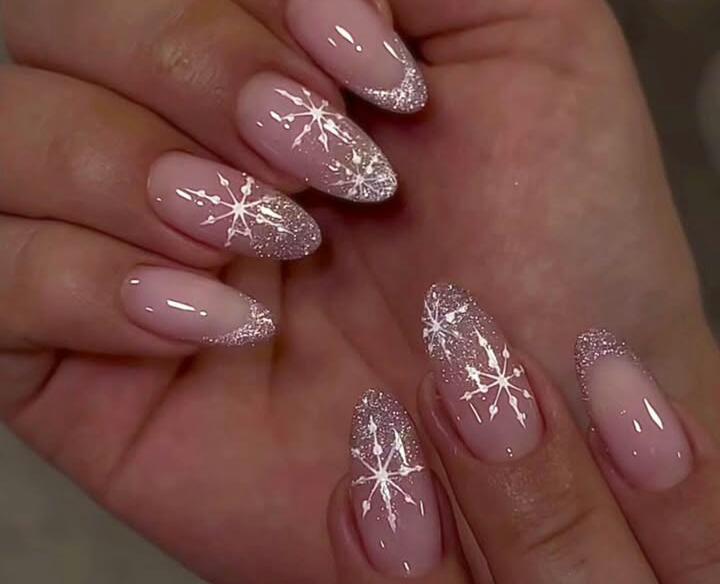 Soft pink nails with glittery ombré tips set the stage for shimmering snowflake designs. The mix of sparkle and pastel tones gives this look a dreamy, frosted-fairy-tale aesthetic.