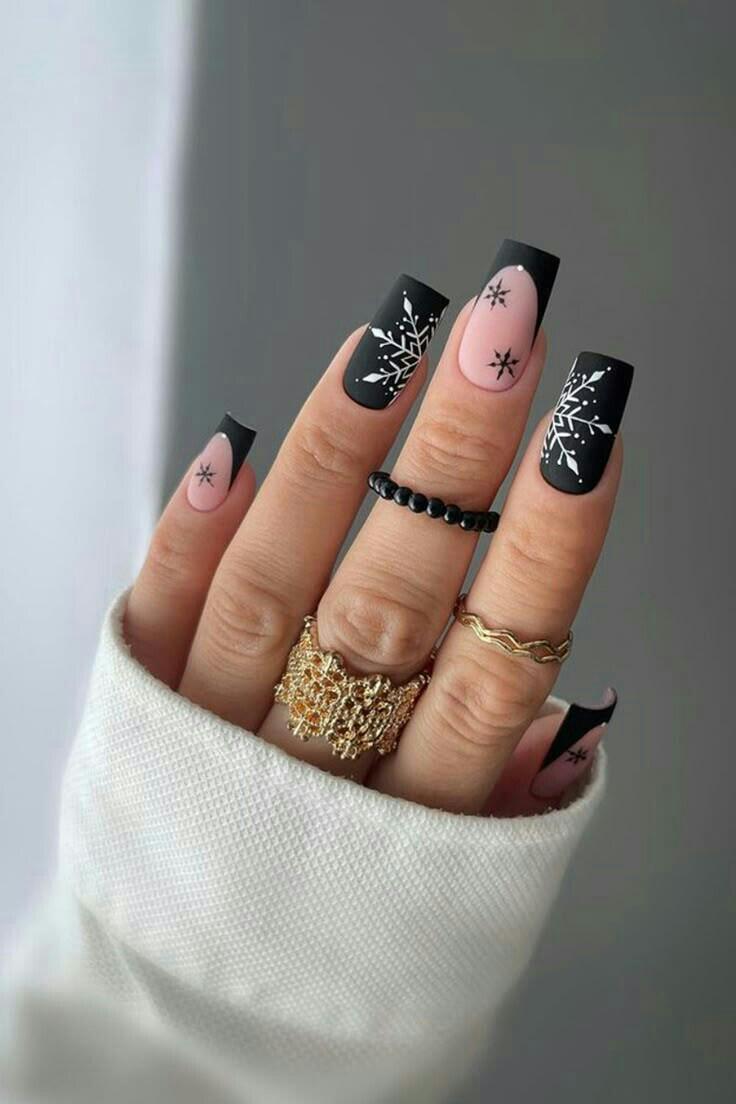Matte black French tips paired with a nude base create a chic, modern winter contrast. White snowflakes and simple star accents add a clean and elegant snowy-night feel.