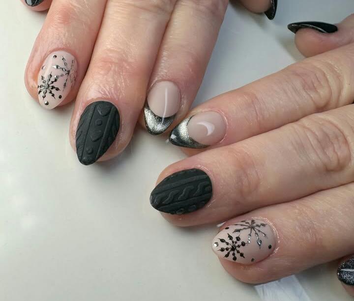 This mixed-style design combines matte black textured sweater-knit nails with glossy nude nails decorated in black and silver snowflakes. It has a cozy yet chic winter vibe, blending softness with bold contrast.