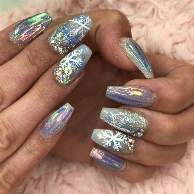 This design features long, shimmering nails with an icy iridescent finish, topped with bold white snowflakes and chunky glitter accents. It has a festive, statement-making winter vibe that’s both sparkling and dramatic.