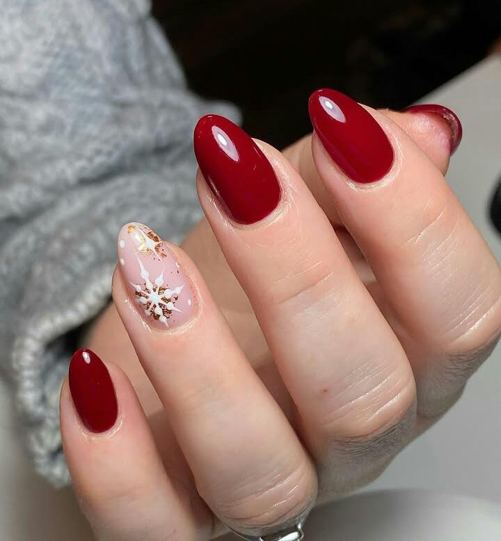 Rich red nails are paired with a single soft nude accent nail featuring a dainty snowflake and a touch of gold foil. The combination gives a cozy, holiday-inspired look that’s elegant but still warm and bold.
