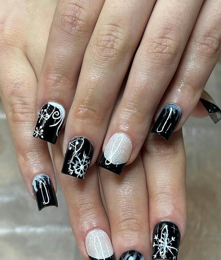 Glossy black nails contrasted with icy white snowflakes and swirling winter patterns create a striking, high-contrast effect. The look is dramatic and modern, giving off a mysterious winter-night vibe.