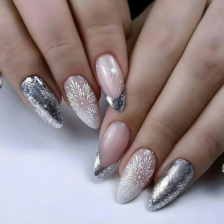 These nails blend soft nude tones with silver glitter tips and intricate white snowflake art. The result is a chic, frosty winter design that feels both classy and festive.