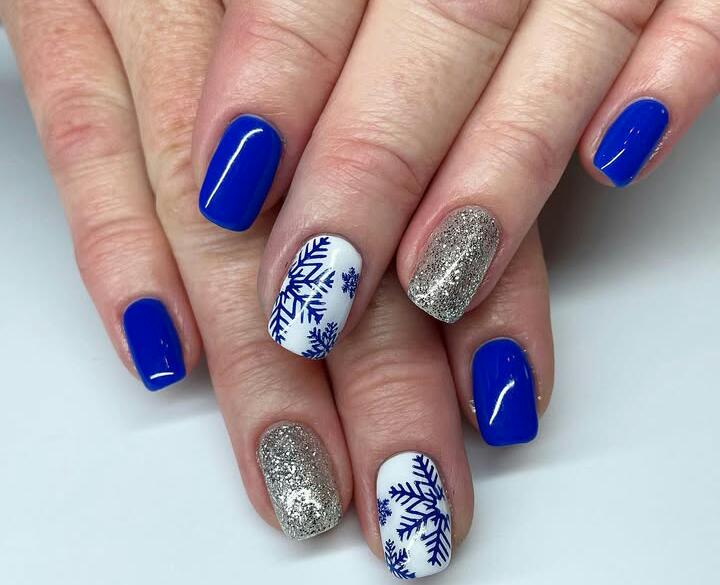 Bright royal blue pops against white accent nails decorated with crisp blue snowflakes, balanced with touches of gold glitter. The overall look is bold, clean, and festive — perfect for a classic winter style.