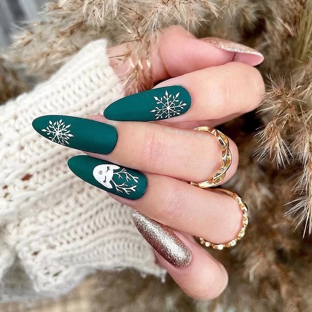 This design mixes deep emerald green matte nails with fine snowflake art and a minimalist reindeer motif. The added gold-glitter nail gives it an elegant, woodland-inspired winter feel.