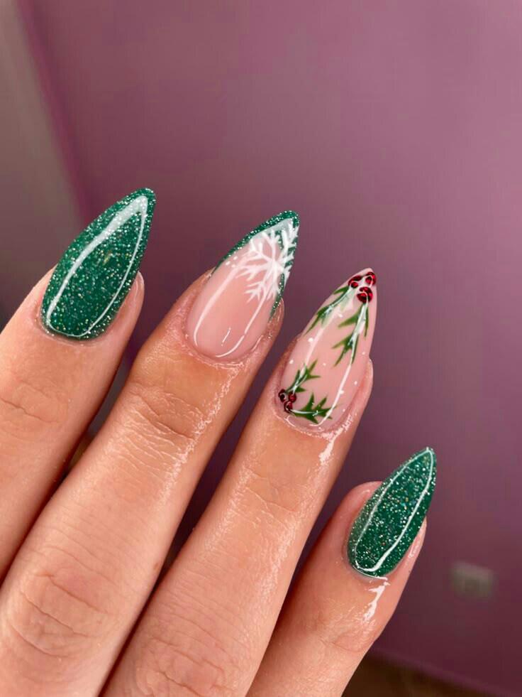 This design mixes deep emerald glitter tips with soft nude bases, highlighted by delicate white snowflakes and holly accents. It feels festive, elegant, and perfect for a cozy winter look.