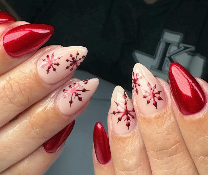 Bright, glossy red nails are paired with nude nails featuring bold red snowflake designs. The contrast gives it a striking, classic holiday vibe with a modern twist.