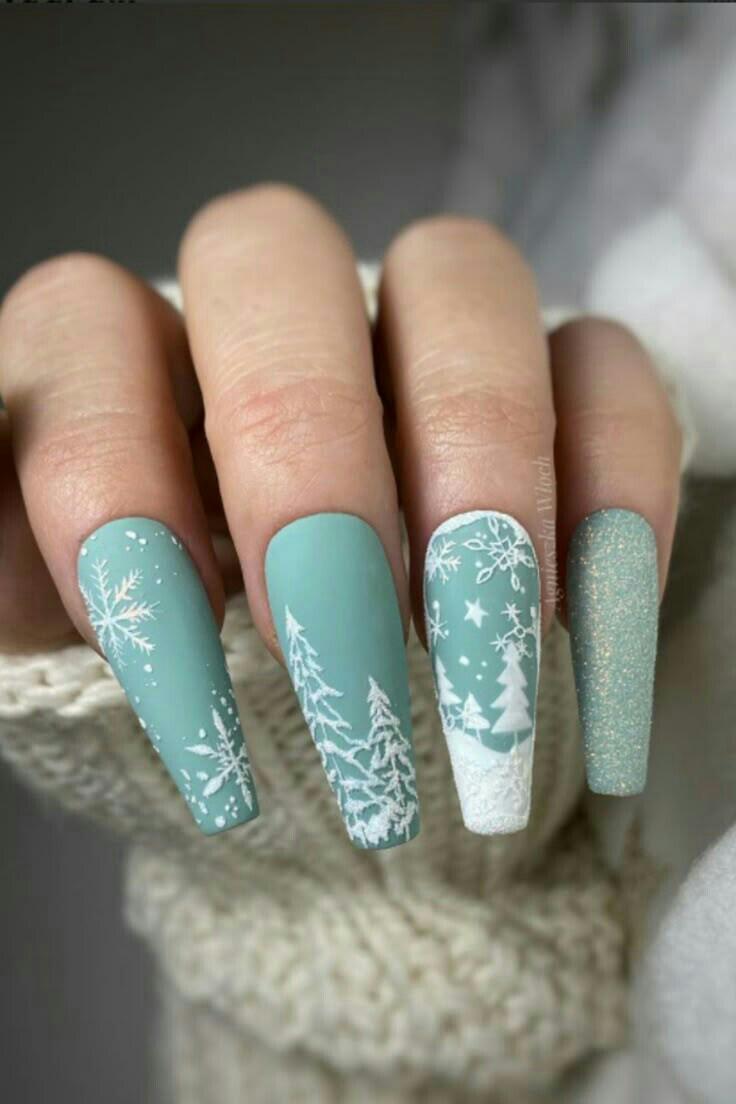Soft matte teal nails are decorated with white winter trees, falling snow, and subtle snowflakes. The long shape and muted colors create a calm, wintry, storybook-like feel.