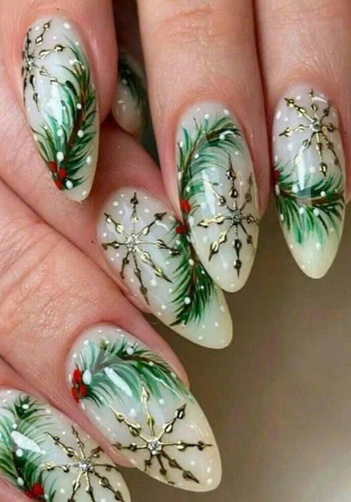 These nails feature hand-painted pine branches and shimmering golden snowflakes over a sheer milky base. The design feels rich, detailed, and beautifully festive without being too bold.