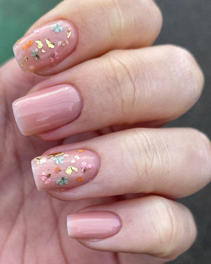 Soft blush pink nails create a delicate base for tiny pressed-flower accents and scattered gold flakes. The design feels light, feminine, and perfectly suited for a fresh april spring look.