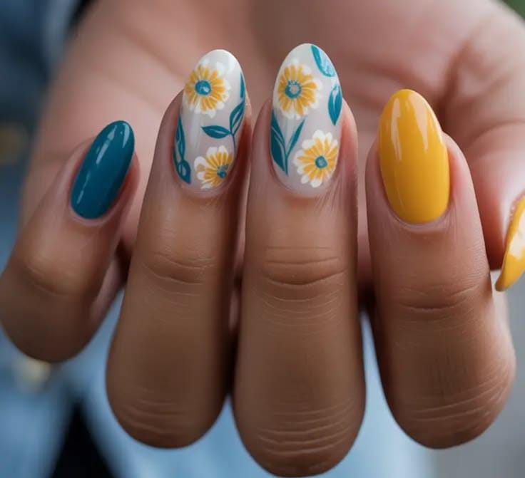 Bright yellow and deep teal shades are paired with white daisy patterns for a bold yet cheerful spring style. The floral artwork on a light base makes the manicure feel lively and inspired by blooming April gardens.