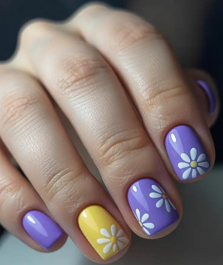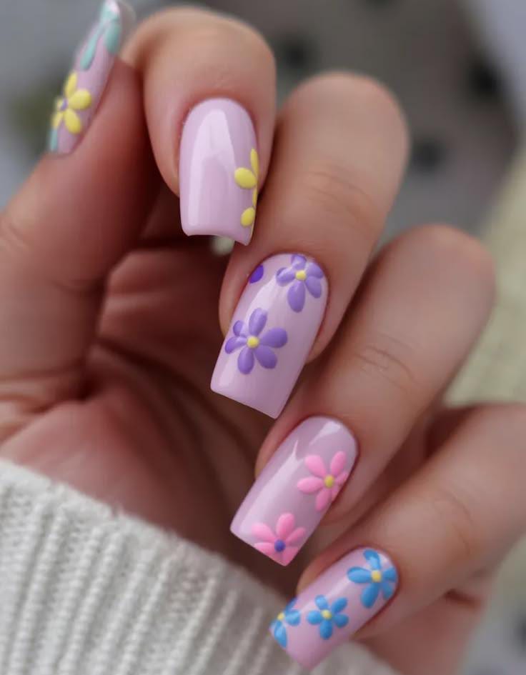 Soft pastel lavender nails are decorated with cute, colorful daisy flowers that give a playful spring vibe. The design feels bright, cheerful, and perfect for a fresh April look.