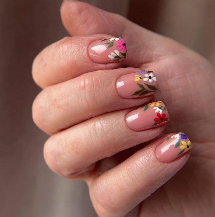 A glossy nude base is decorated with tiny colorful flowers and leafy details, giving the nails a light April garden-inspired feel. The design looks soft, elegant, and perfect for a subtle spring vibe.