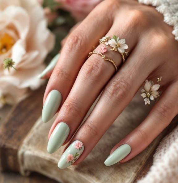 Muted sage green April nails create a calm and elegant spring look with a smooth glossy finish. A delicate floral accent adds a soft romantic touch that feels fresh and natural.