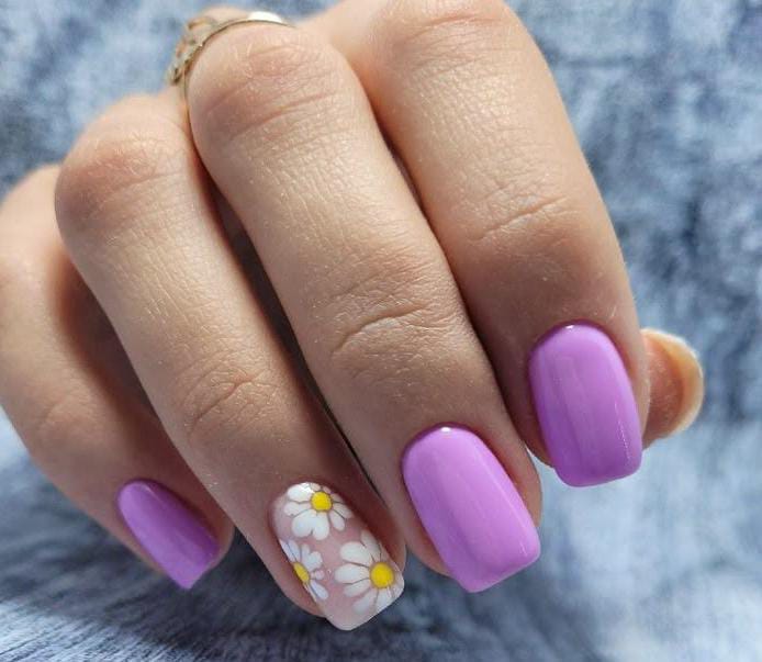 Bright lavender April nails bring a cheerful spring vibe with their smooth glossy color. The accent nail with white daisies and yellow centers adds a cute and playful floral detail.