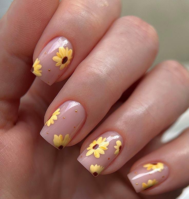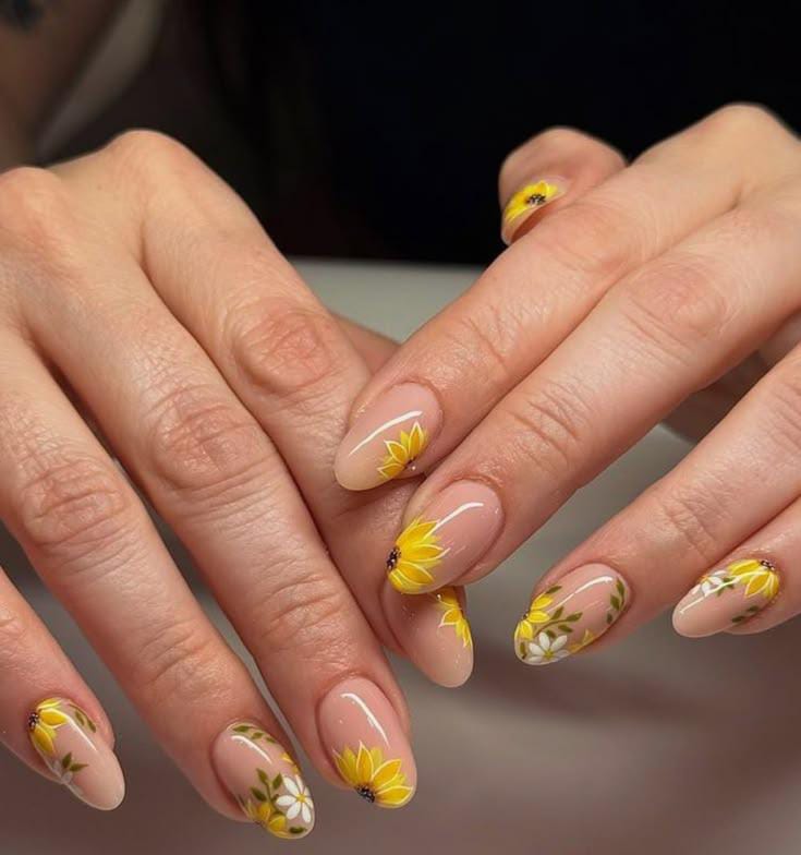 Soft nude nails are decorated with delicate yellow sunflower and green leaf accents and tiny white flowers for a fresh spring feel. The glossy finish and subtle floral placement create a light, cheerful, and elegant April vibe.