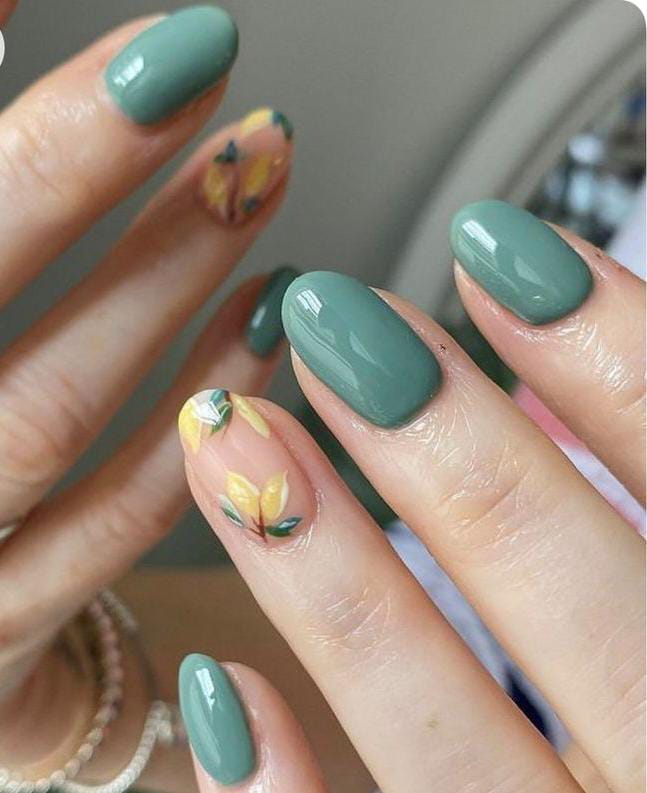 This design combines elegant sage green nails with accent nails featuring soft yellow floral artwork on a clear base. The muted green color paired with delicate flowers creates a calm, natural April spring aesthetic.