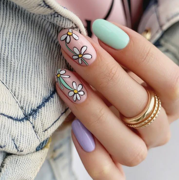 These April nails feature soft pastel shades like mint green and lavender paired with a light pink base decorated with white daisy flowers. The colorful yet gentle palette gives the design a cheerful and playful springtime vibe.