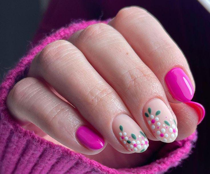 Bright glossy pink nails are paired with soft nude accents decorated with dotted floral-like patterns and tiny green leaves. The playful colors give the design a cheerful and lively spring vibe in April.