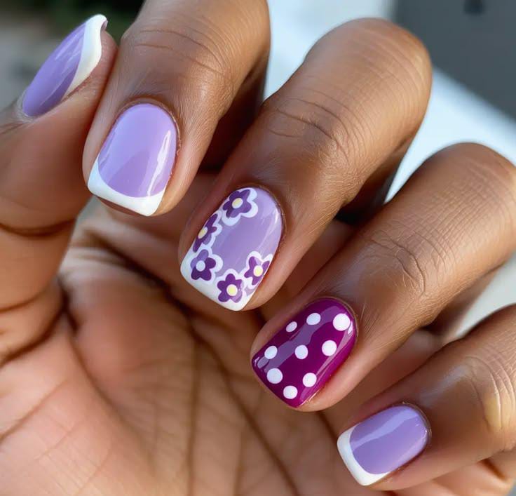 This design combines glossy lavender April nails with white French tips, tiny floral patterns, and a bold purple polka-dot accent. The mix of patterns and soft purple tones creates a fun and stylish spring look.