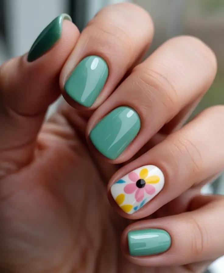 Soft mint green April nails create a fresh and calm spring look. One accent nail features a colorful daisy on a white base, adding a playful floral touch.