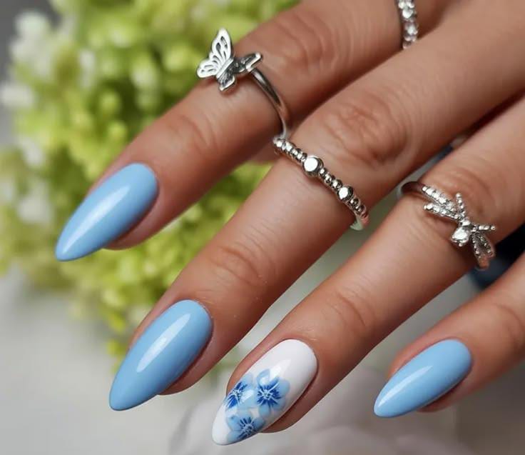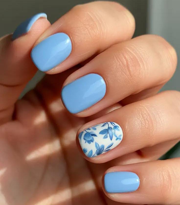 These nails use a smooth pastel blue polish that feels light and airy for spring. A white accent nail with delicate blue floral patterns adds an elegant April botanical vibe.