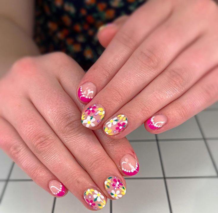 This design combines bright pink French dotted tips with cheerful floral accents on a clear base. The colorful flowers give the nails a fun and lively April springtime feel.