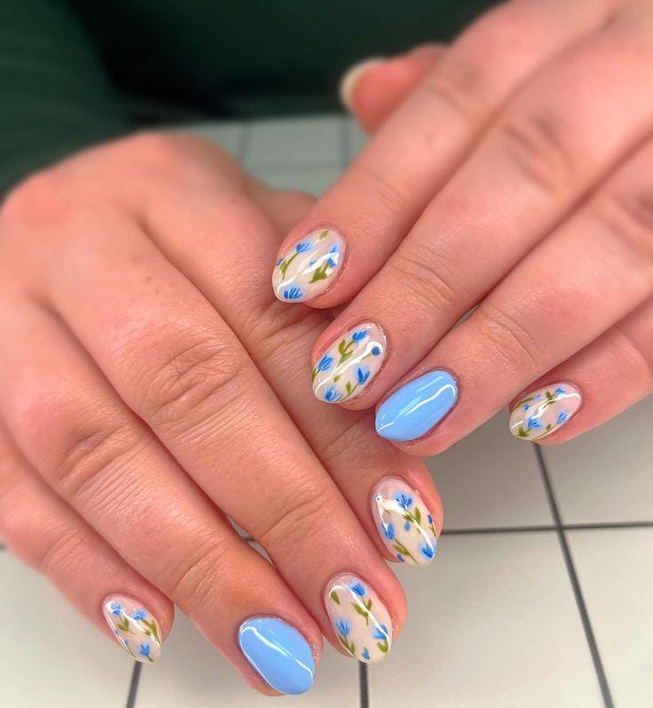 Soft sky blue April nails are paired with delicate floral designs on a neutral base. The tiny blue and green flowers create a gentle garden-inspired spring look.