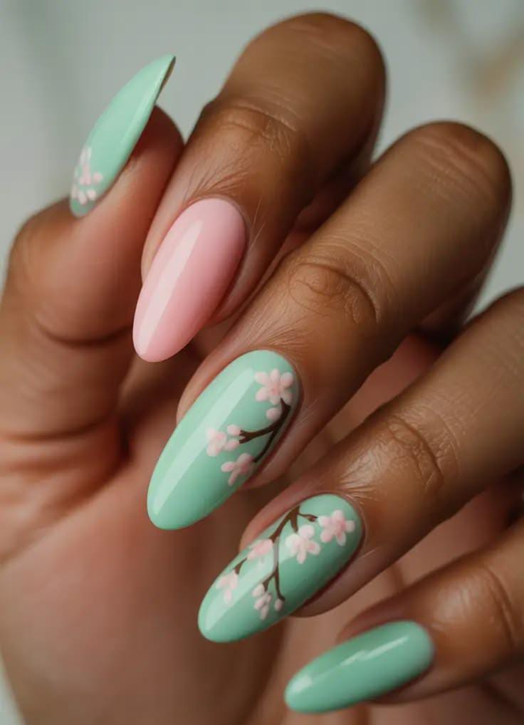 Soft mint green April nails are paired with a blush pink accent for a gentle spring color palette. Delicate branch flowers painted on the mint nails create a calm cherry-blossom inspired look.