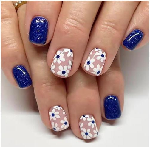 Bright cobalt blue glitter April nails are paired with soft nude nails decorated with simple white daisies and blue centers. The design feels fresh, cheerful, and perfect for a playful spring look.