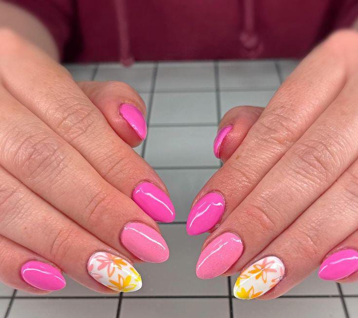 Glossy bright pink nails create a vibrant base while two accent nails feature delicate orange and yellow floral patterns on white. The design looks bright, feminine, and full of April springtime energy.