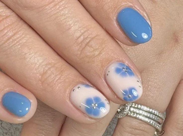 Glossy sky-blue April nails are combined with a soft white accent nail featuring delicate blue floral art. The overall style looks clean, elegant, and calm with a subtle spring vibe.