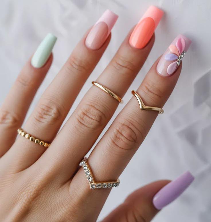 Long pastel April nails feature soft shades like mint, coral, blush, and lavender french tips for a playful spring palette. A 3D flower accent with a small gem adds a cute, feminine touch that feels bright and seasonal.