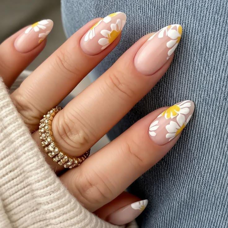These nails feature a natural nude base with delicate white and yellow daisy flowers across the tips. The style looks elegant, light, and beautifully inspired by April spring blossoms.