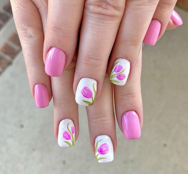 Bright pink April nails are paired with soft white accent nails featuring simple pink tulip artwork. The design feels clean, feminine, and perfectly suited for a light spring style.