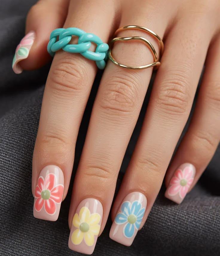 These nude base nails feature large, colorful daisy flowers in soft pastel shades that create a playful retro spring look. The design feels bright, cheerful, and perfect for a fun April style.