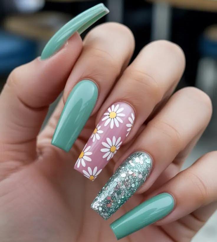 This design mixes glossy green nails with a pink accent nail covered in tiny white daisies. A sparkling glitter nail adds extra shine, giving the set a trendy and eye-catching spring vibe and perfect for April.