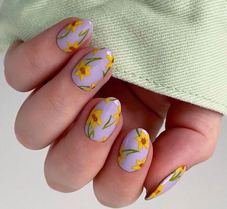 Soft lavender April nails are decorated with small yellow daisy flowers and delicate green stems. The design feels fresh, cheerful, and perfect for a light spring vibe.