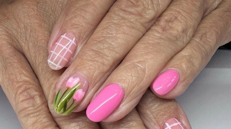 A mix of glossy pink nails features a tulip floral accent and a soft white grid pattern. The design looks bright, playful, and very fitting for a fresh April manicure. 🌸