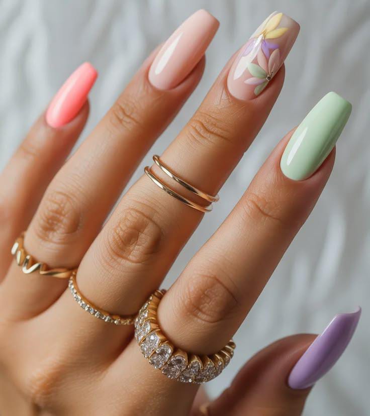 These long nails feature soft pastel shades like pink, mint green, nude, and lavender. One accent nail has a delicate pastel flower, giving the design a light and fresh April spring feel.
