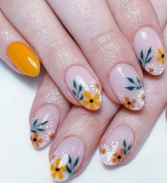 A soft nude base is decorated with cheerful yellow flowers and green leafy details, paired with a bright yellow accent nail. The look feels warm, playful, and inspired by April blooming spring gardens.