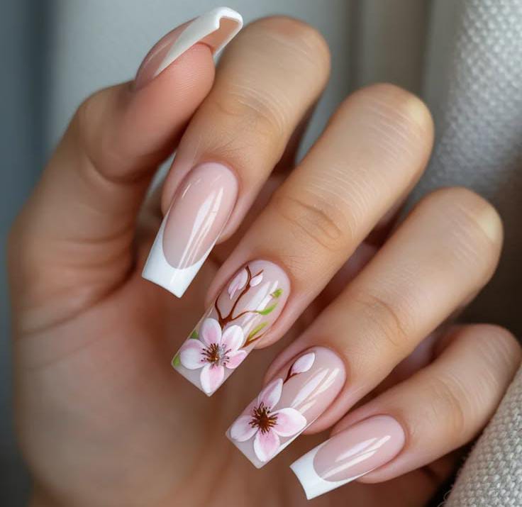 Classic white French tip nails are paired with soft pink blossom flowers on a glossy nude base. The design feels elegant, delicate, and perfect for a fresh April spring manicure.