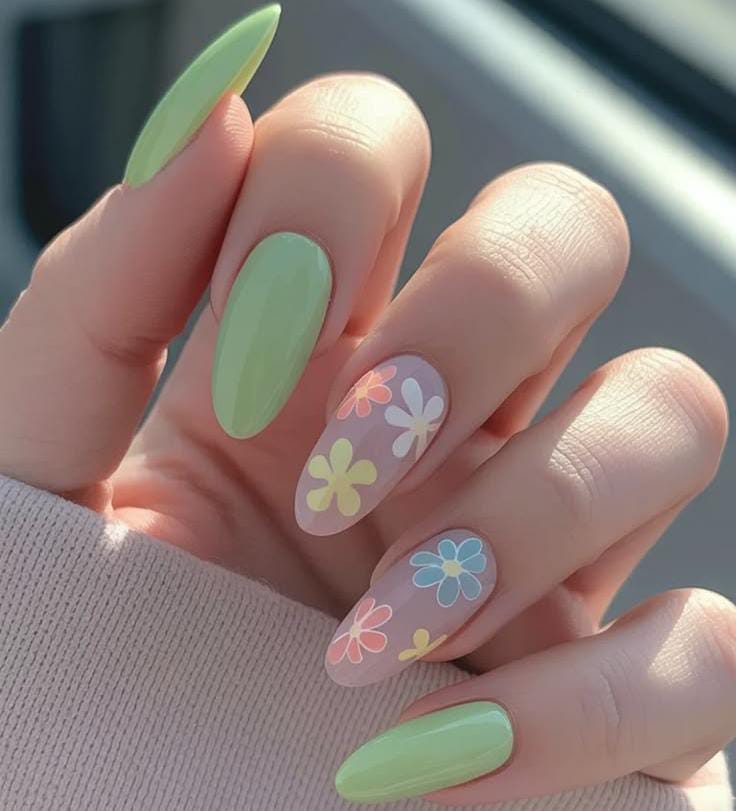 Soft pastel lime green April nails are paired with sheer nude accent nails decorated with colorful daisy flowers. The design feels fresh, playful, and perfect for a light springtime look.